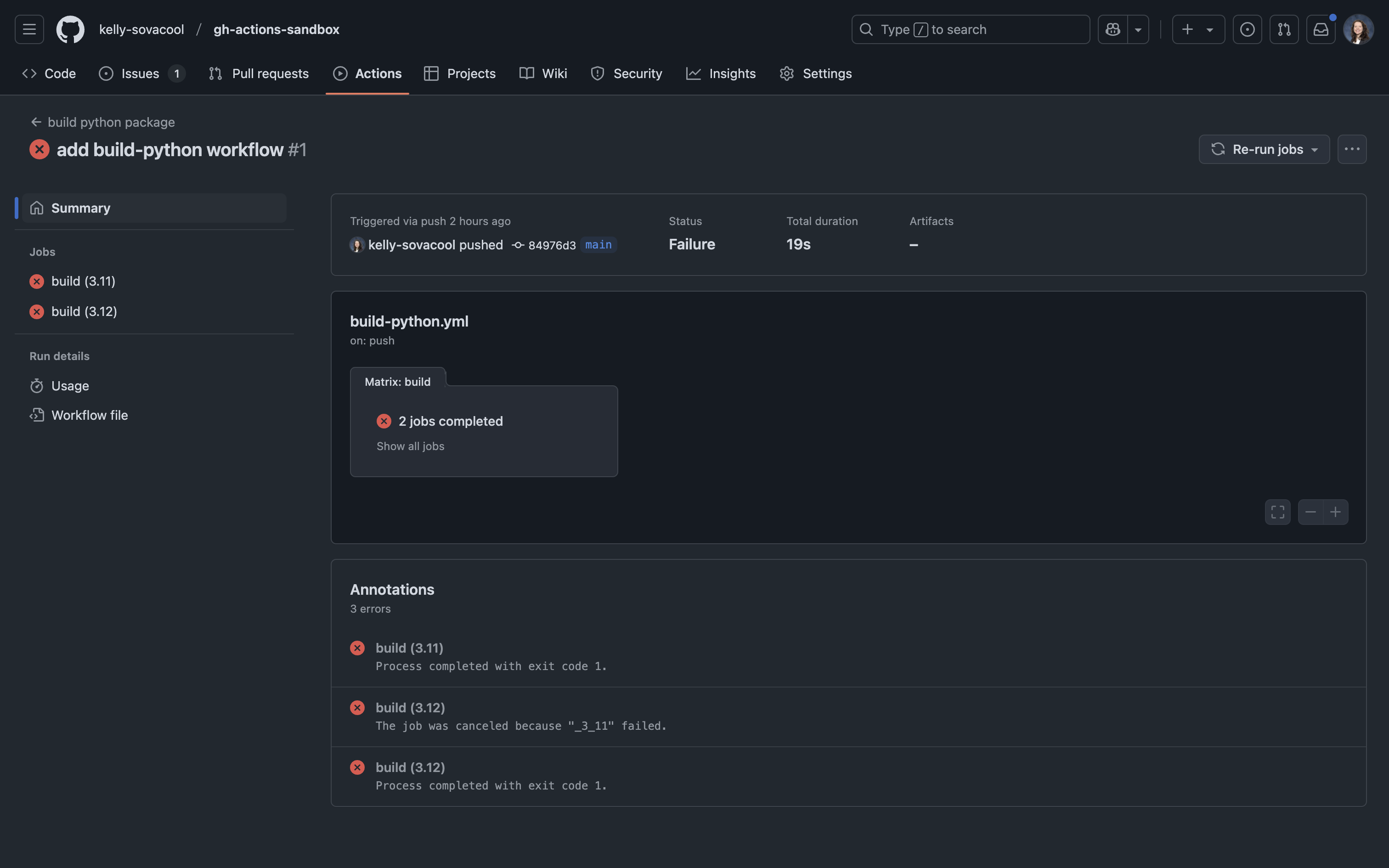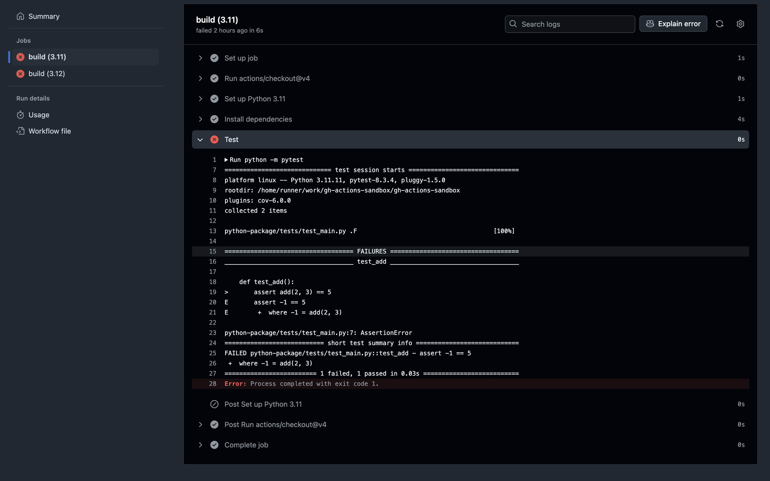 Take a look at the workflow status: a green check ✅ means it passed and a red X ❌ means it failed. Let’s investigate the logs to find out why it failed. Click on one of the build jobs and take a look at the pytest step.